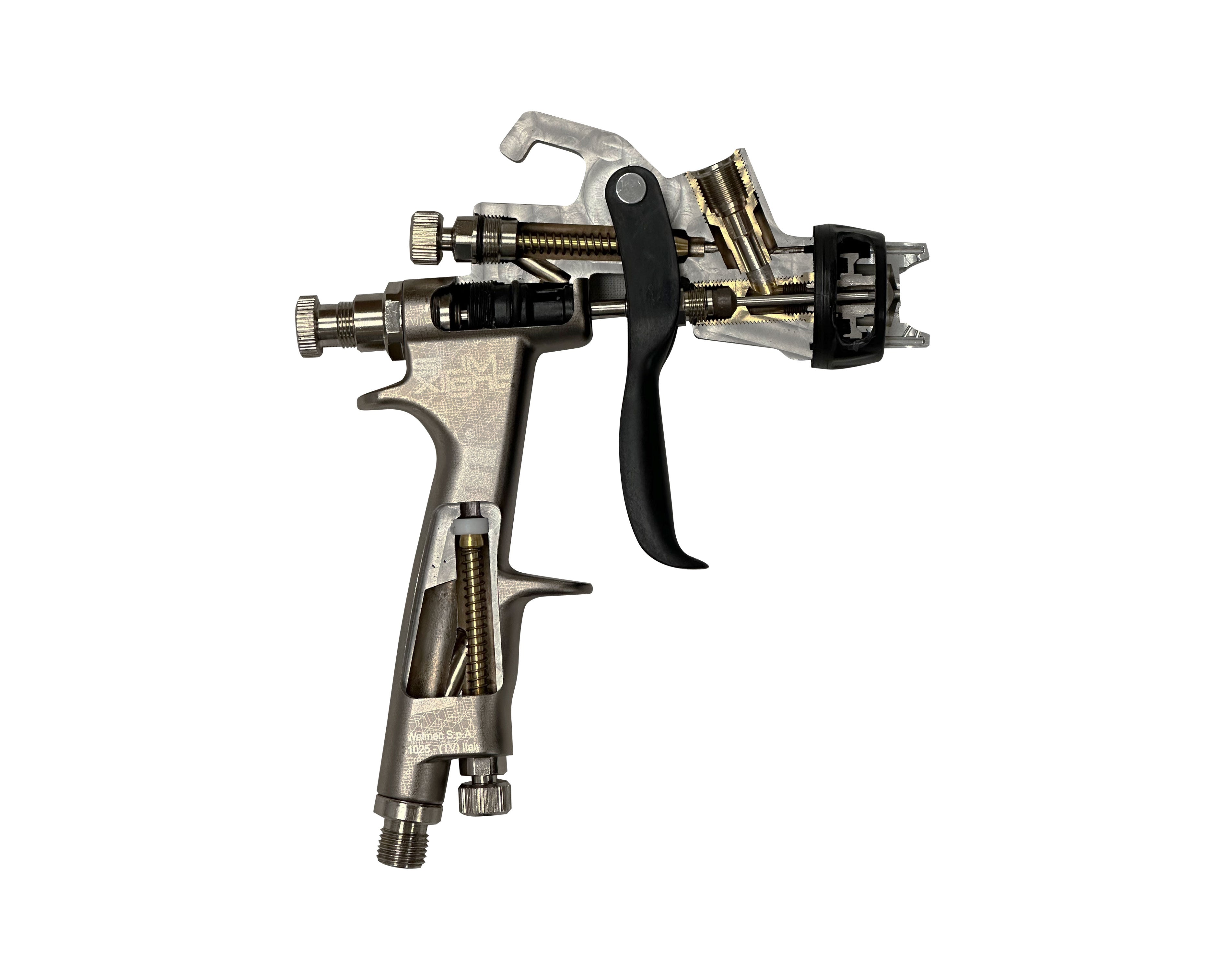 The latest addition to the Slim family, Slim XLight combines the traditional reliability of this historic line with new solutions aimed at improving aesthetics, weight, cleanliness and, above all, performance. The matt nickel plating, enriched by a unique laser cutting, offers a guarantee of sealing and durability, the new body, shaped and lightened, makes the spray gun more manageable.